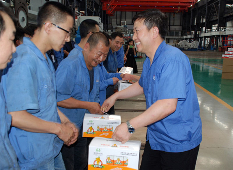 何付忠和劉勝一同為職工代表送上了慰問(wèn)品。