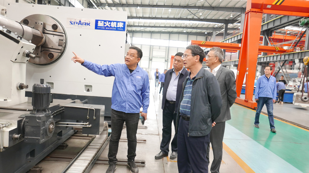 在企業(yè)生產(chǎn)現(xiàn)場,星火機(jī)床集團(tuán)公司董事長蔣保權(quán)向馬海福一行詳細(xì)介紹了企業(yè)歷史沿革、項(xiàng)目建設(shè)進(jìn)展,公司研發(fā)生產(chǎn)的高端數(shù)控纏繞設(shè)備、大型五軸聯(lián)動(dòng)車銑復(fù)合加工中心、超大筒體數(shù)控開孔設(shè)備、斜床身數(shù)控車床等產(chǎn)品的技術(shù)優(yōu)勢、應(yīng)用領(lǐng)域和未來市場前景,以及集團(tuán)公司所屬的紅山試驗(yàn)機(jī)公司相關(guān)情況后,進(jìn)行座談交流。