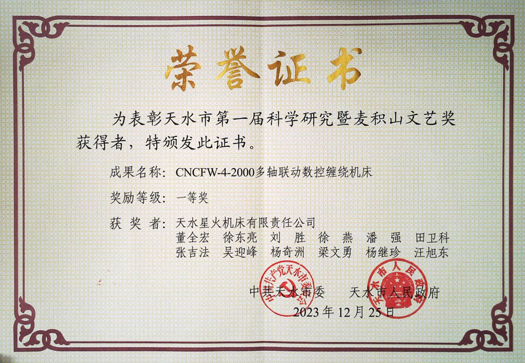 1228日,天水市第一屆科學研究暨麥積山文藝獎表彰大會召開,全市147項成果榮獲天水市第一屆科學研究暨麥積山文藝獎。其中科學技術類55項、哲學社會科學類50項、文學藝術類42項。星火機床公司CNCFW-4-2000多軸聯動數控纏繞機床獲科學技術類一等獎。